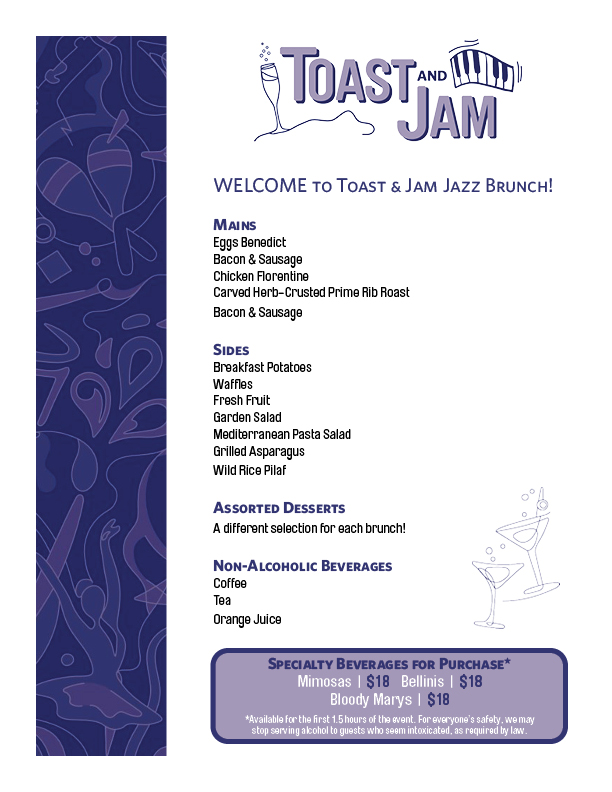 Ticket prices include a fabulous brunch by Executive Chef Karl Elliott. Brunch menu to be announced soon. Bellinis, Bloody Marys and Mimosas will be available for purchase.